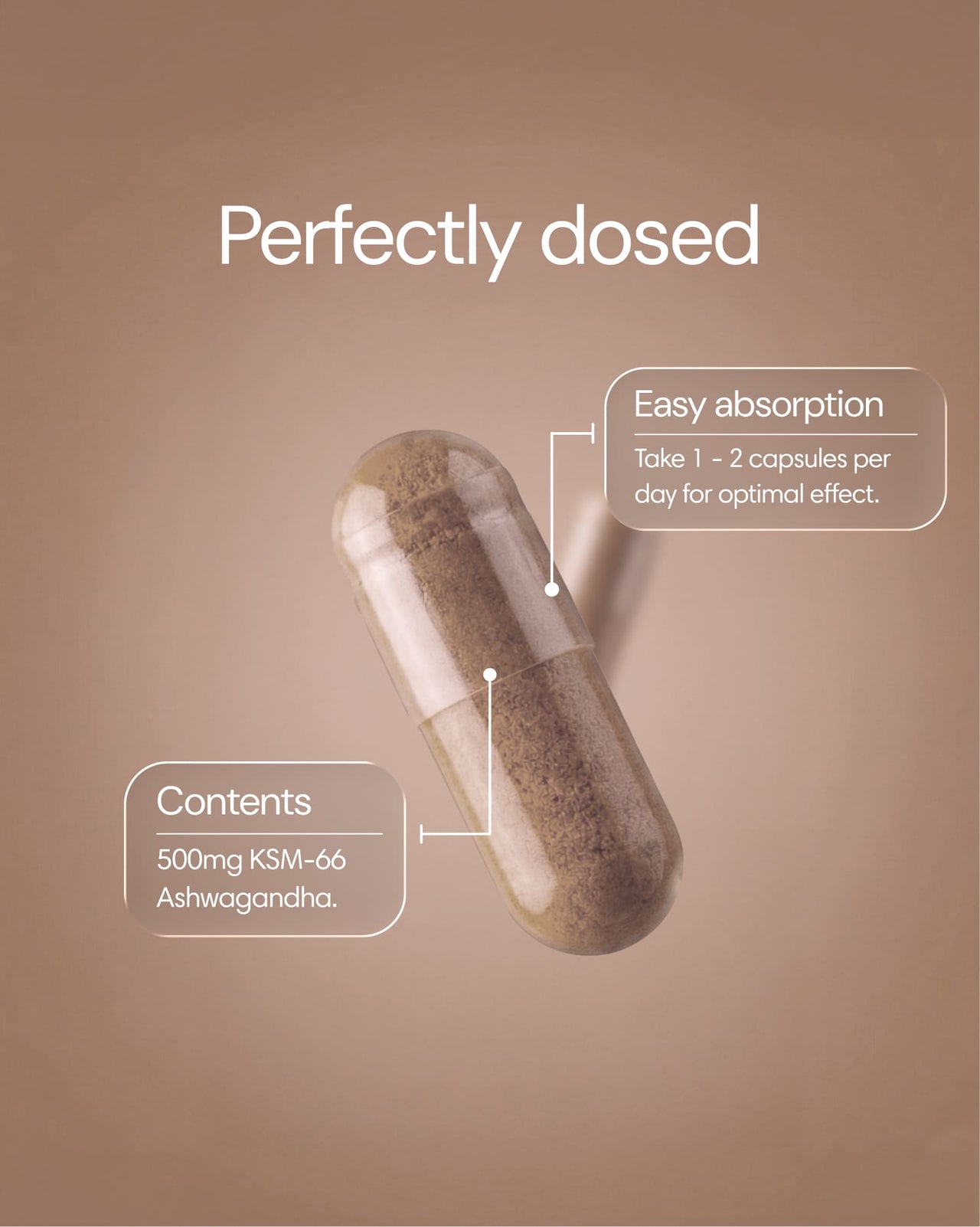 Take 1–2 capsules daily with water, preferably during or after a meal. Because ashwagandha contains both water- and fat-soluble compounds, a meal helps your body absorb it better.